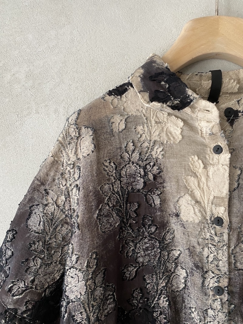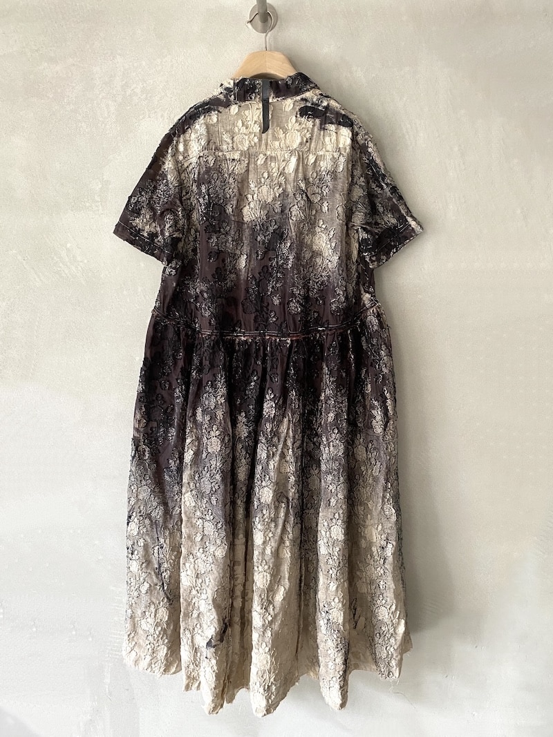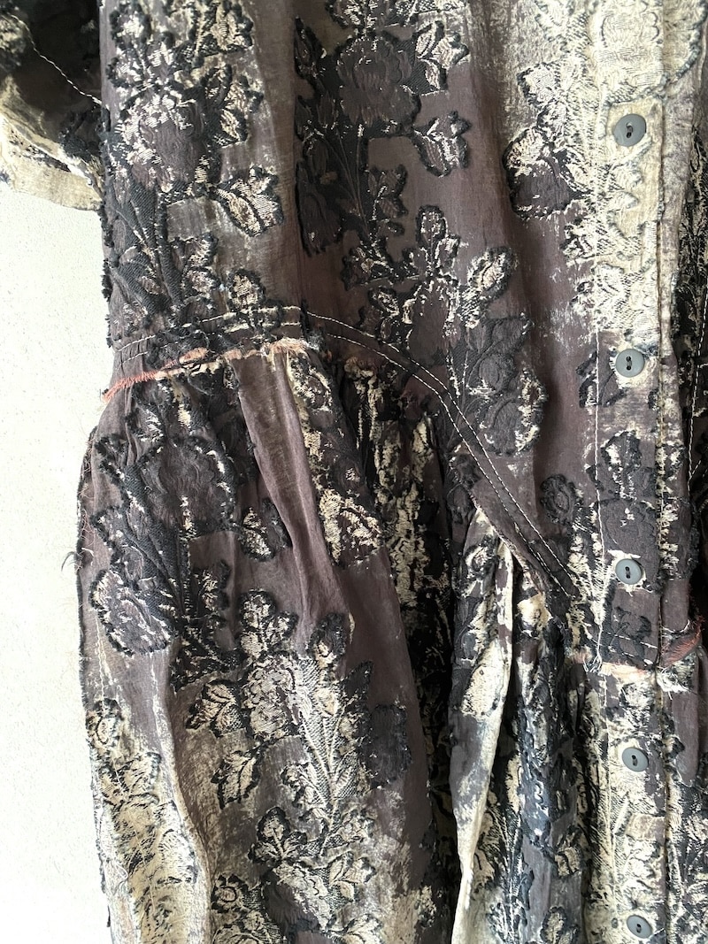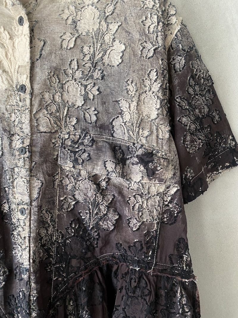 Abito oversize in cotone devoré dipinto a mano con lavorazione floreale. Collo alla coreana asimmetrico con apertura frontale chiusa da 14 bottoni. Maniche corte con linea ampia. Una tasca a toppa con patta sul davanti.Taglio in vita con arricciatura che crea volume nella parte inferiore del capo. Linea morbida e fluida. Rifiniture a taglio vivo su collo, maniche e fondo. Ogni capo presenta variazioni di colore e disegno dovute alla lavorazione manuale.