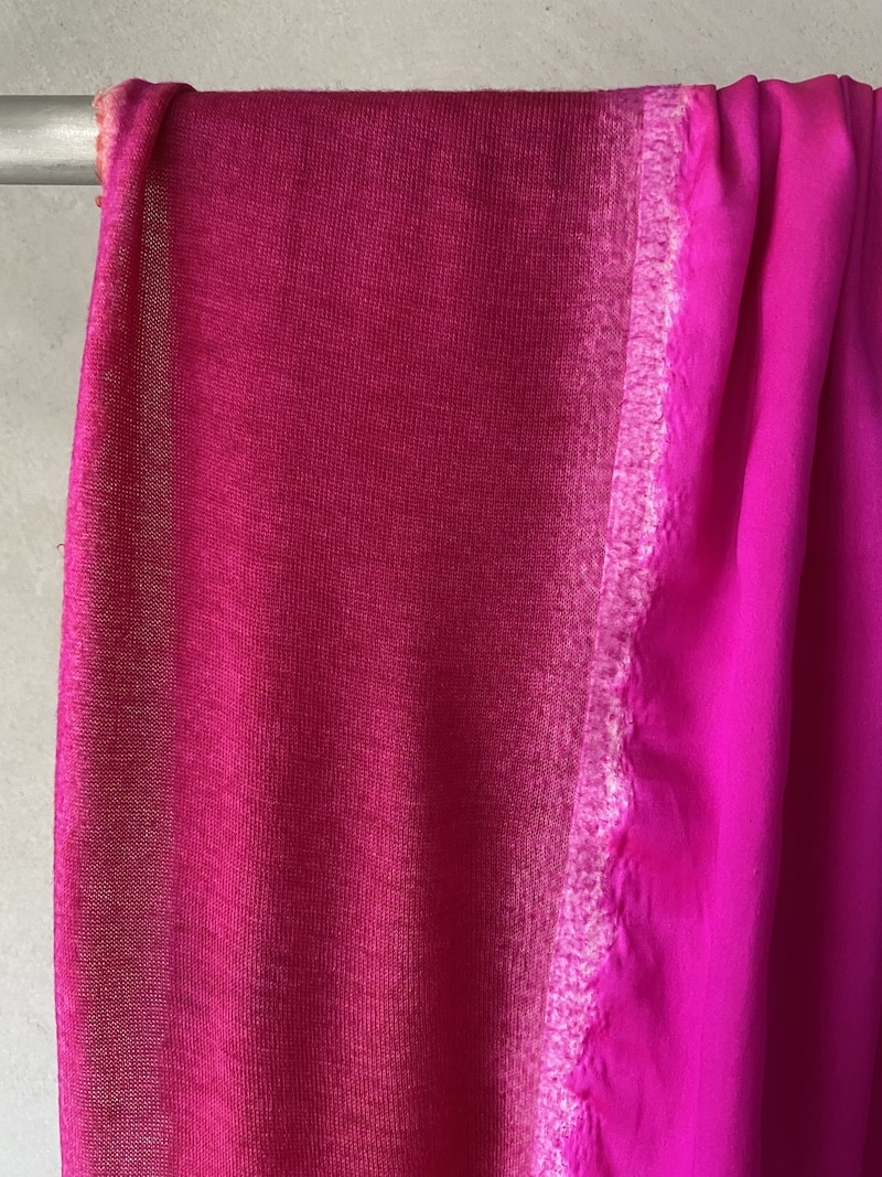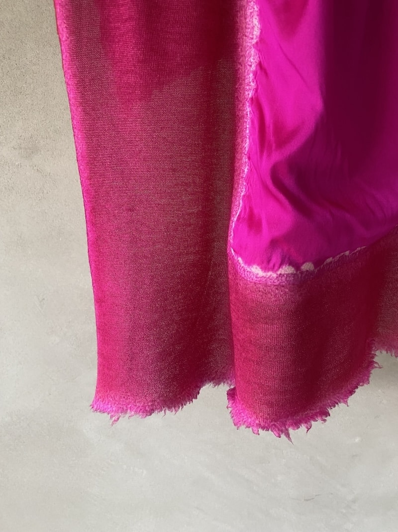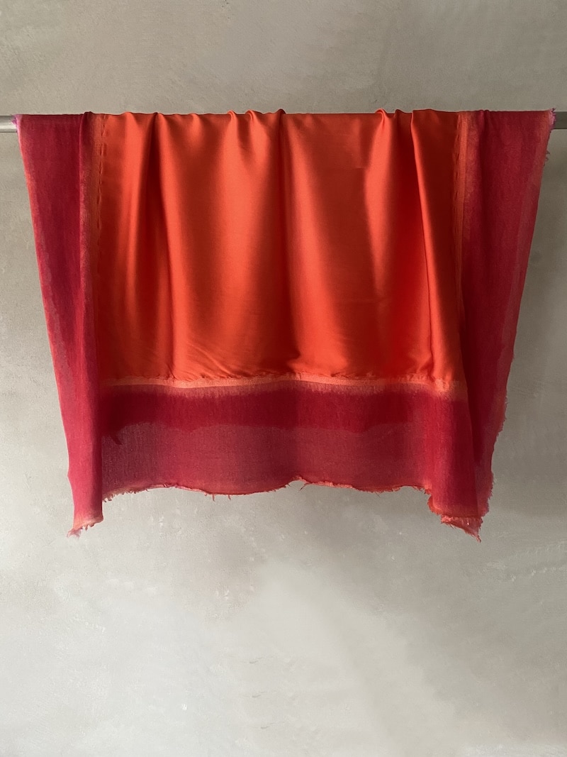 Stola quadrata in doppio raso di seta double face, caratterizzata da un gioco di due colori a contrasto. La parte centrale in raso liscio è incorniciata da un bordo in maglia di cashmere e seta che crea un delicato effetto materico e sfumato. I bordi sono rifiniti a taglio vivo per un aspetto morbido e naturale.