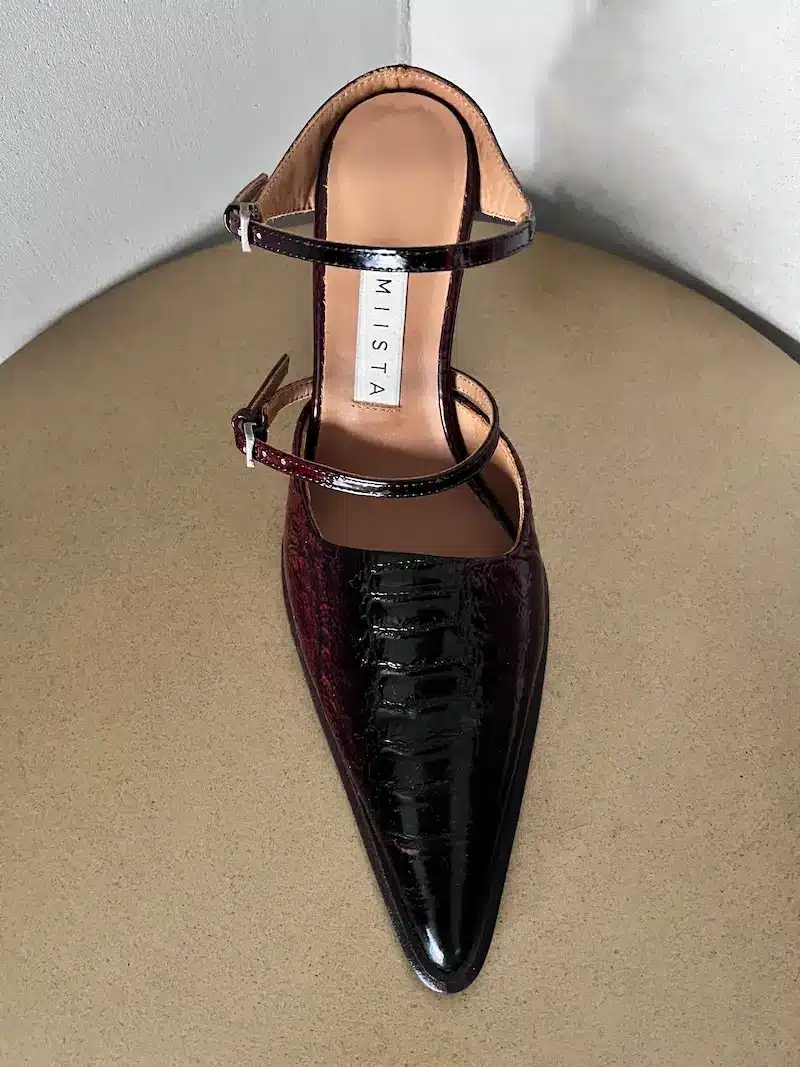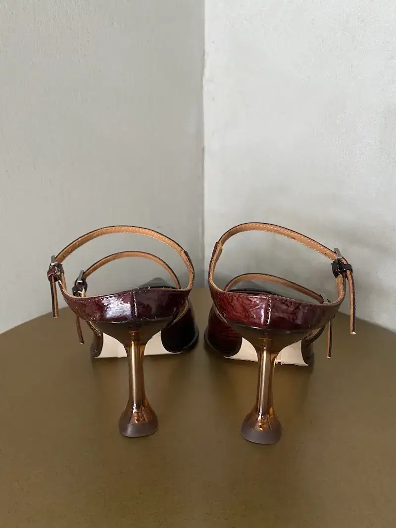 Scarpe slingback realizzate in pelle martellata lucida color bordeaux, con doppie fasce sottili e fibbie metalliche. Tacco scultoreo 9 cm.