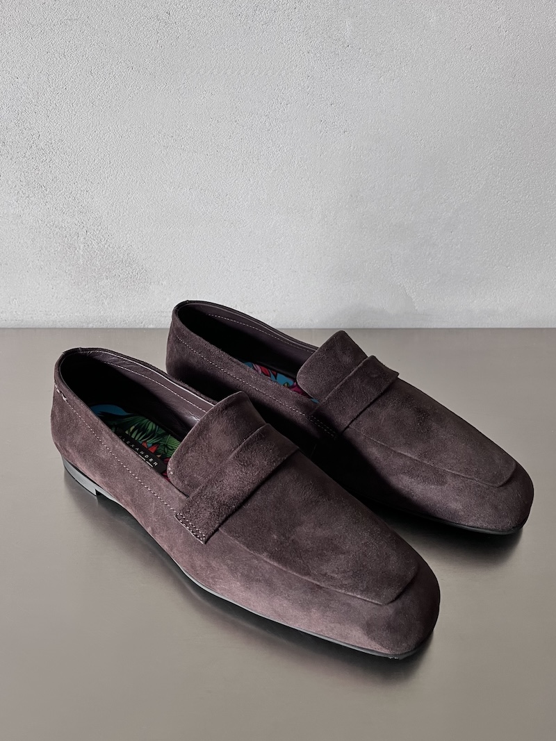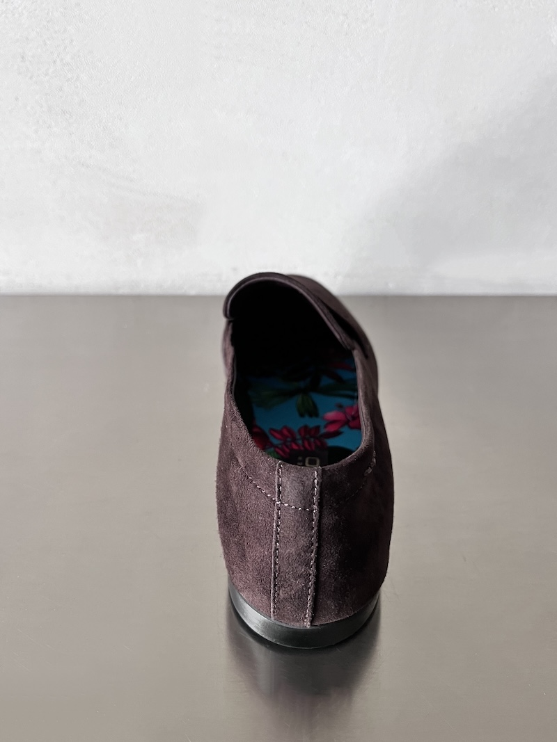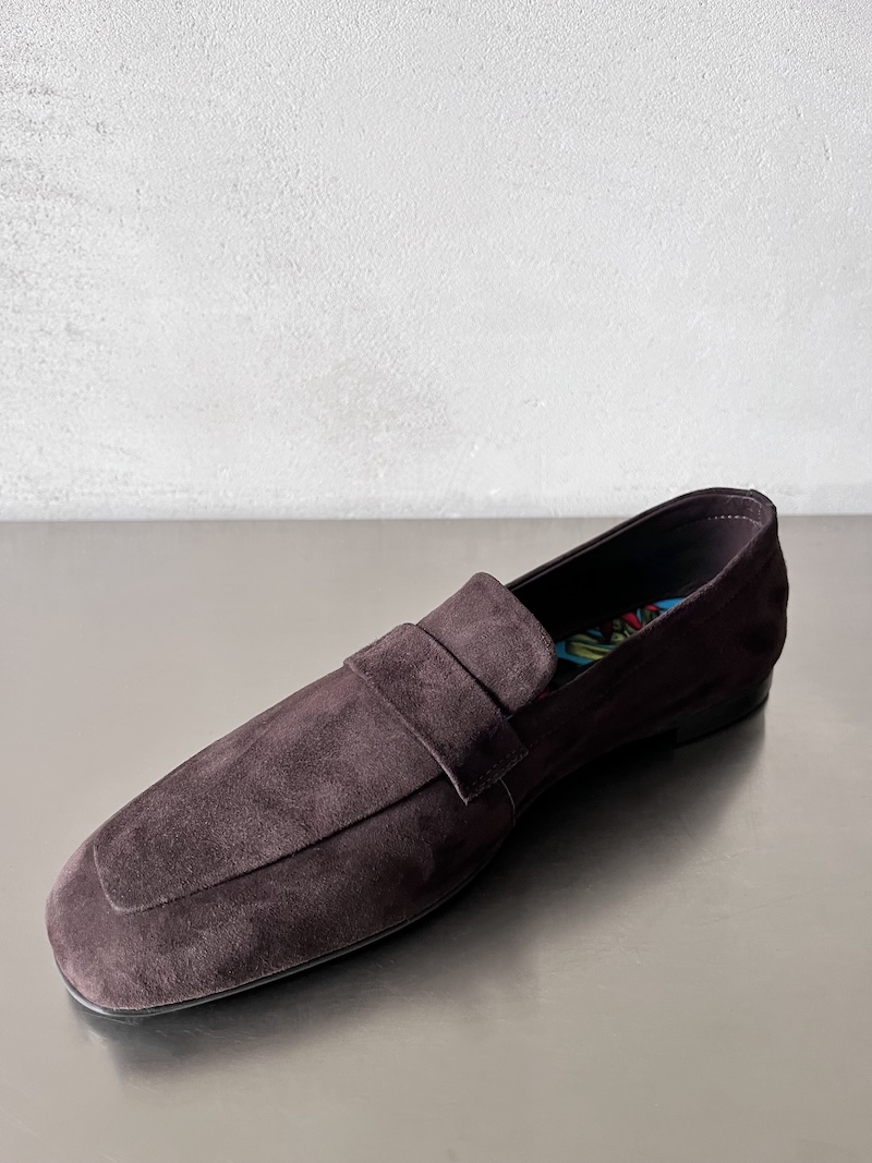 Mocassino in pelle scamosciata. Presenta tomaia pulita con mascherina frontale e cuciture essenziali a vista. Punta leggermente arrotondata e linea affusolata. Costruzione slip-on senza lacci per una calzata pratica e confortevole. Suola bassa con tacco accennato. Design minimale ed elegante.