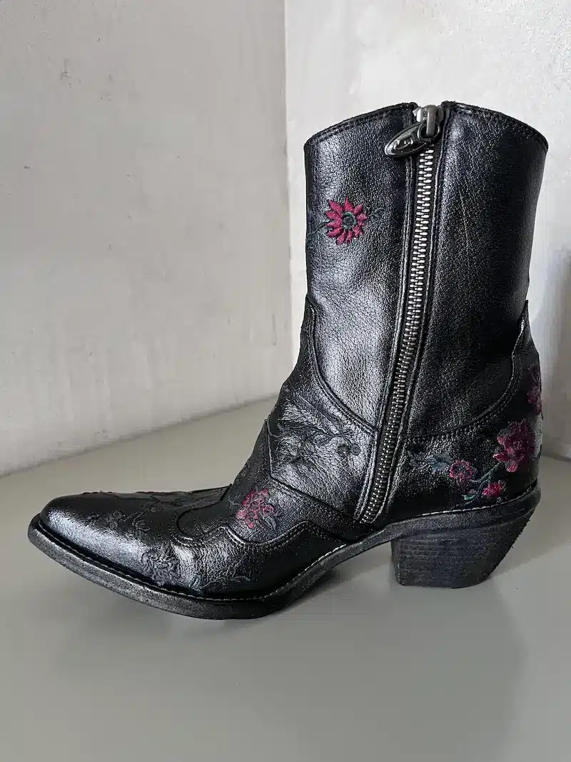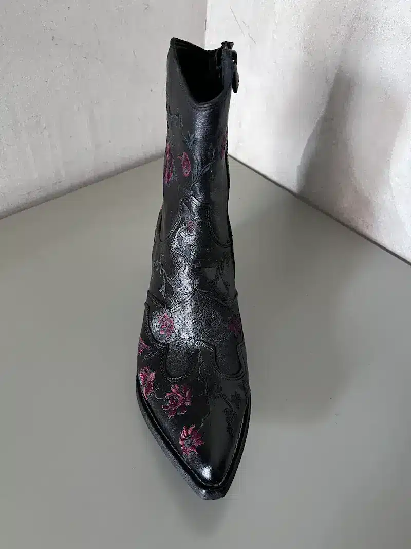 Stivaletto texano ricamato con fiori rossi e foglie verdi realizzati a mano con filo semilucido. Forma classica affusolata, chiusura laterale interna con zip, tacco in legno altezza 6 cm, suola in cuoio con inserti in gomma.
